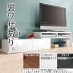 大型テレビ対応!背面収納付きTVボード。引出しの前板はほど良い光沢の鏡面仕上げ。背面にはコード収納スペースがあるのでコンセント類や配線もスッキリ収まります。キャスター付きで配線作業、お掃除もラクラク