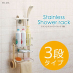 お風呂アイテムをスッキリ収納ステンレス シャワーラック/3段 sn-FH-315 取り付け簡単、ステンレス製だから清潔!石けん皿/タオル/小物が掛けられるフック付!